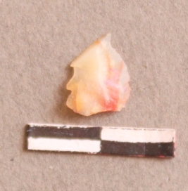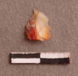 | Description / विवरण | This is a very small flaked of chalcedony with orange bands. There is a bulb of percussion seen on one side and other side had flaked removed and a retouch the centre. |