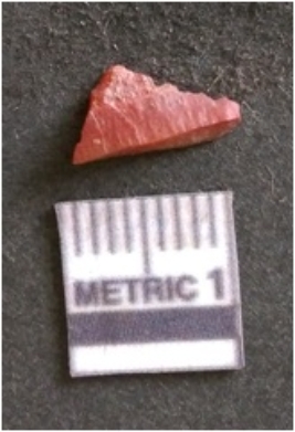 | Description / विवरण | The chalcedony flake is pale in color and translucent in appearance. The piece has s harp flaked ends and a bulbous end due to flaking. The flake has a crypto-crystalline silica matrix with reddish in color. |