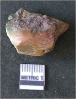 | Description / विवरण | The chert piece is dark in color, with a prominent bulb of percussion and sharp flaked edges. The piece is a part of lithic debitage or raw material for lithic knapping. |