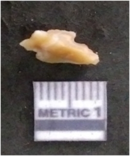 | Description / विवरण | It is a chalcedony flake, with a bulb of percussion on the ventral side. Cortex on one end. |