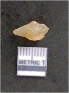 | Description / विवरण | It is a chalcedony flake, with a bulb of percussion on the ventral side. Cortex on one end. |