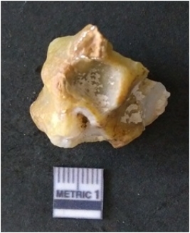 | Description / विवरण | The agate piece is translucent in appurtenance, with angular flaked edges and a bulb of percussion. The piece shows flake scars on the surface. |