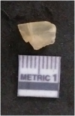 | Description / विवरण | It is a chalcedony flake, with a bulb of percussion on the ventral side. Cortex on one end. |
