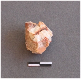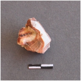 | Description / विवरण | It s a chalcedony fragment. Its red in color, numerous ripples due to deposition. Its bigger flake with negative bulb of percussion some ripples marks pointing flaking activity. Sharp angular edges are visible. |
