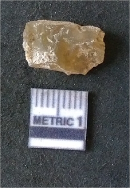 | Description / विवरण | The smoky quartz fragment shows prominent flaks scars and sharp flaked ends as a result of flaking. The piece is translucent white and shows cryptocrystalline matrix. |