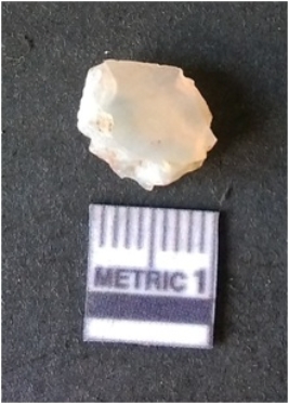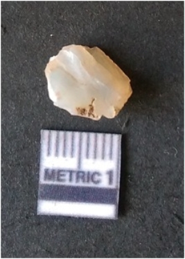 | Description / विवरण | The quartz fragment shows prominent flaks scars and sharp flaked ends as a result of flaking. The piece is translucent white and shows cryptocrystalline matrix. |