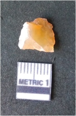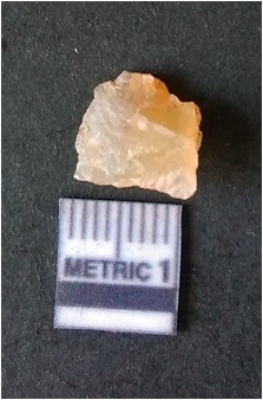 | Description / विवरण | The Chalcedonyy flake is pale yellow in color. Translucent in appurtenance. The piece is shows sharp pointed ends and flake scars on the surface. As a result of flaking. |