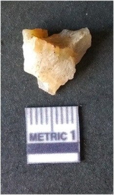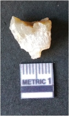 | Description / विवरण | The smoky quartz fragment shows prominent flaks scars and sharp flaked ends as a result of flaking. The piece is translucent white and shows cryptocrystalline matrix. |