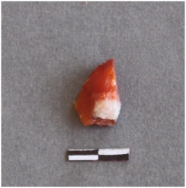 | Description / विवरण | The carnelian piece is roughly triangular with a sharp ridge and sharp edges. The ripple marks are clear, due to flaking. End of the piece has a quartz encrustation. |