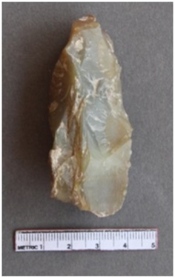 | Description / विवरण | It is a quartz nodule. Elongated in shape. It has heavy flake ridges with ripples marks on the surface. The cortex is quite visible on one end of the nodule. |