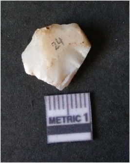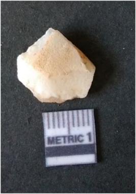 | Description / विवरण | The quartz fragment shows prominent flaks scars and sharp flaked ends as a result of flaking. The piece is translucent white and shows cryptocrystalline matrix. |
