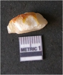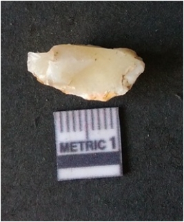 | Description / विवरण | The quartz fragment shows prominent flaks scars and sharp flaked ends as a result of flaking. The piece is translucent white and shows cryptocrystalline matrix. |