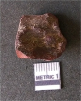 | Description / विवरण | The chert piece is dark in color, with a prominent bulb of percussion and sharp flaked edges. The piece is a part of lithic debitage or raw material for lithic knapping. |