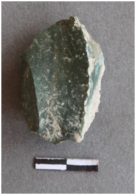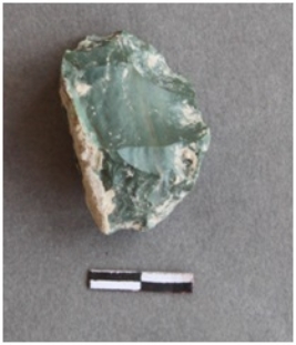 | Description / विवरण | It is chert nodule. Greenish in color. Flake ridges visible on the surface. Cortex on one side of the lateral margin. |
