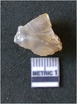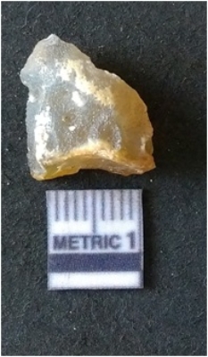 | Description / विवरण | The agate piece is grey in color. Crypto crystalline in nature and has sharp flaked edges. The piece has a part of cortex preserved on the dorsal side. |