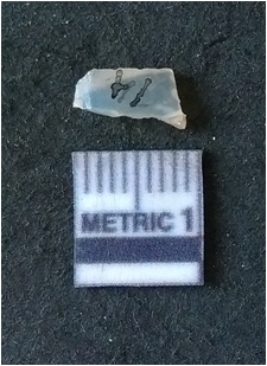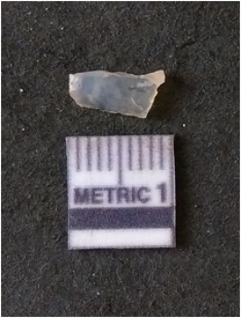 | Description / विवरण | The chalcedony flake is flat, with flaked ridges. The piece is crypto crystalline in nature and pale white in color. |