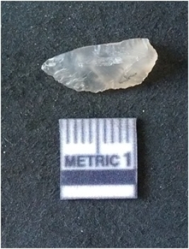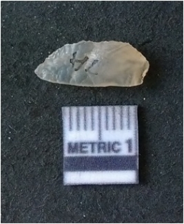 | Description / विवरण | The chalcedony flake is flat, with flaked ridges. The piece is crypto crystalline in nature and pale white in color. |