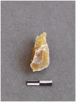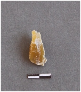 | Description / विवरण | The chalcedony fragment has numerous negative bulbs on one side due to flaking, and a positive bulb on other side. The piece has a pointed end and a prominent medium ridge as a result of flaking. The piece is golden yellow in color. |
