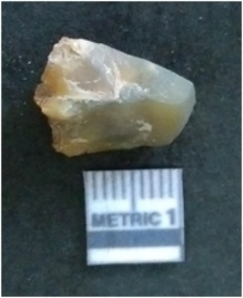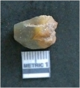 | Description / विवरण | It is a chalcedony flake, with a bulb of percussion on the ventral side. Cortex on one end. |