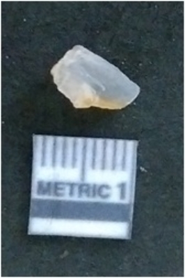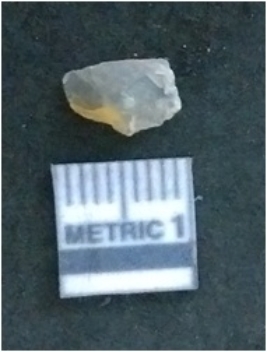 | Description / विवरण | It is a chalcedony flake, with a bulb of percussion on the ventral side. Cortex on one end. |