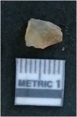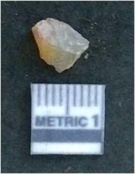 | Description / विवरण | It is a chalcedony flake, with a bulb of percussion on the ventral side. Cortex on one end. |