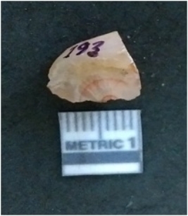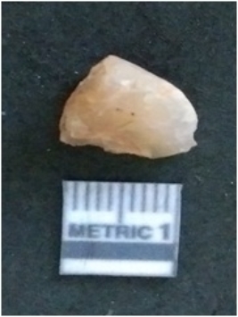| Description / विवरण | It is a chalcedony flake, with a bulb of percussion on the ventral side. Cortex on one end. |