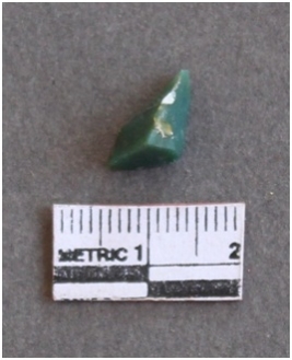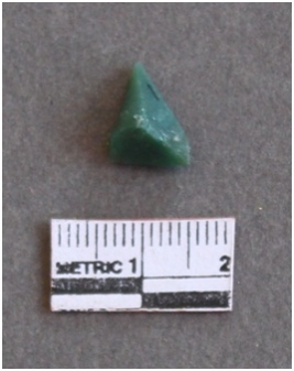| Description / विवरण | Chert stone fragment with sharp ridges and bulb of percussion, green in color. |