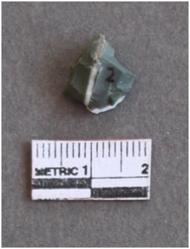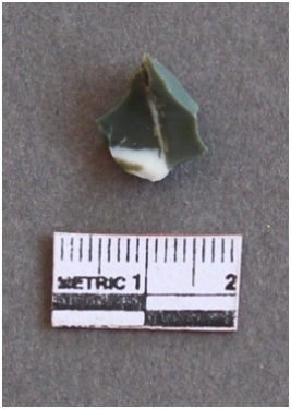 | Description / विवरण | Jasper fragment with white band, flaked surface and bulb of percussion partially seen. |