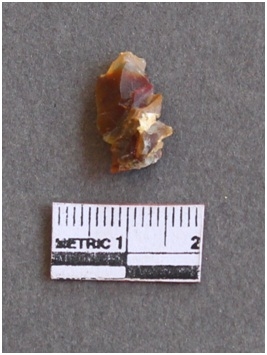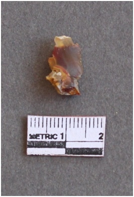| Description / विवरण | Carnelian fragment with ferrous impurities and bulb of percussion seen. Flaked ridges on the other side. |