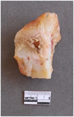 | Description / विवरण | This is a chalcedony stone core, with surface impurities and portions removed for manufacturing tools. |