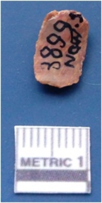 | Description / विवरण | It is lithic debitage, the flakes are seen on the dorsal surface while the ventral surface is plain. The sides are sharp and retouched. |