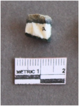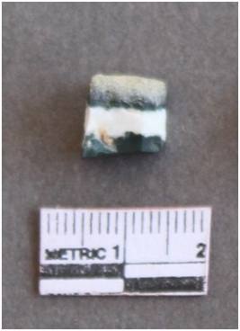 | Description / विवरण | The fragment is a quartz piece with squarish shape and appears in layers of white and green. |