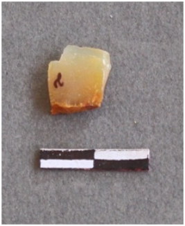 | Description / विवरण | It s a jasper flake, with a pointed end and broadens towards the base. Bulb of percussion is visible. |