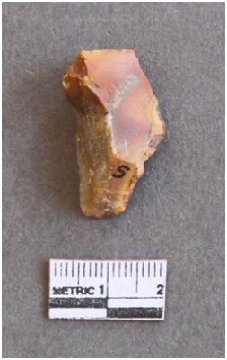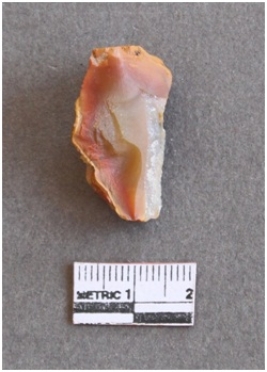 | Description / विवरण | Chalcedony fragment with bulb of percussion and internal impurities. Portion of cortex seen. |