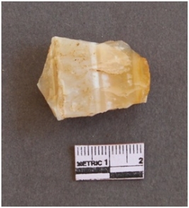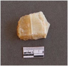 | Description / विवरण | The chalcedony fragment is roughly squarish in shape, flake and orange in color. Partial flaking is evident on the surfaces. |
