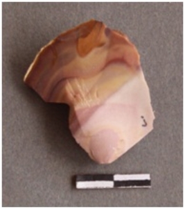 | Description / विवरण | Jasper numerous flakes on one side and a clear cortex at one end. jasper piece has a reworked edge. |