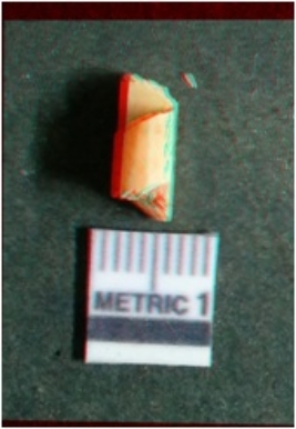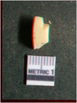 | Description / विवरण | The shell bangle piece is small, pale white in colour with sharp edges and a flat rectangular section. The piece shows some curvature and a lined groove on the surface. |