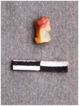| Description / विवरण | The fragment have bulb of percussion and sharp edges, the fragment is carnelian and red piece. |