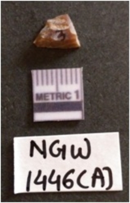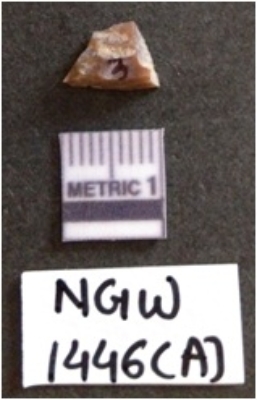 | Description / विवरण | This lithic waste is a thin flake with prominent bulb of percussion seen, with sharp edges, grey in color. |