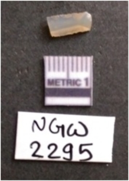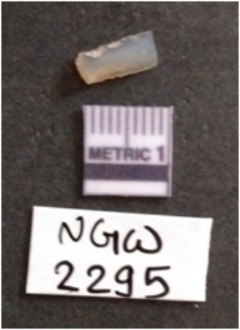 | Description / विवरण | This is a chalcedony flake with promient bulb of percussion on one end, transparent and retouched |