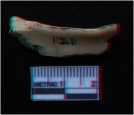| Description / विवरण | The shell fragment is pale yellowish in color, with rough cut edges. The piece is a part of shell object manufacture debitage. One side of the piece is smooth owing to natural shell polish. The other side is coarse. |