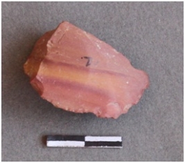 | Description / विवरण | Banded chert stone with bulb of percussion and flaked ridges, ripples are also seen. |