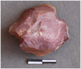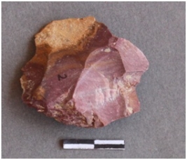 | Description / विवरण | A big fragment of chert with a small fraction of cortex, bands and calcium deposit on one corner, roughly removed flake from the surface, reddish in color. |