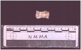 | Description / विवरण | The bead roughout is white in colour with orange bands. The roughout shows working of first step in bead making. |
