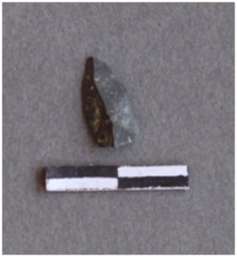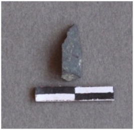 | Description / विवरण | Black chert fragment with a pointed edge, ridges and a striking platform. |