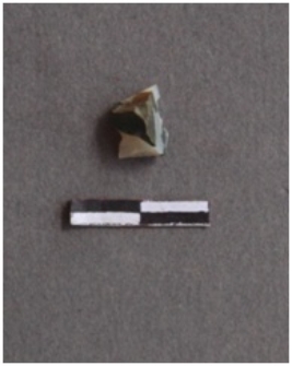 | Description / विवरण | The jasper fragment is with a sharp point and slightly broad base. Flake ridges on the surface. |