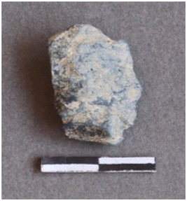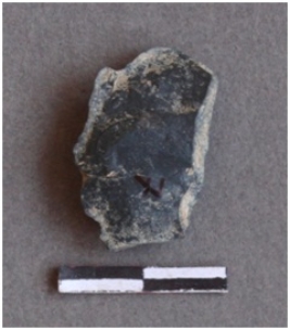 | Description / विवरण | Grey fine grained chert stone with a cortex fraction with surface deposit. |