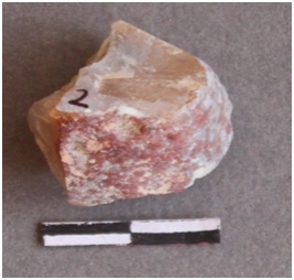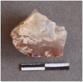 | Description / विवरण | Quartz fragment with one surface covered with a cortex with ferrous impurities. Flaked had been removed from the surface, there are some dark banded impurities internally. |