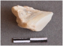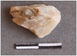 | Description / विवरण | Milky quartz fragment with bands and un even cortex. |