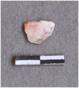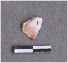 | Description / विवरण | This is a thin flake of chalcedony with a thin fraction of cortex translucent with a thin of orange in one corner and circular ripples on one surface. |
